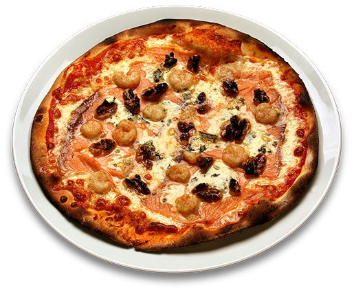 Gambas, Mozzarella, Nueces, Queso azul, Salmón, Tomate.
