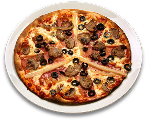 Tomate, Espárragos, Olivas, Champiñones, Jamón de York, Bacon, Mozzarella, Orégano.